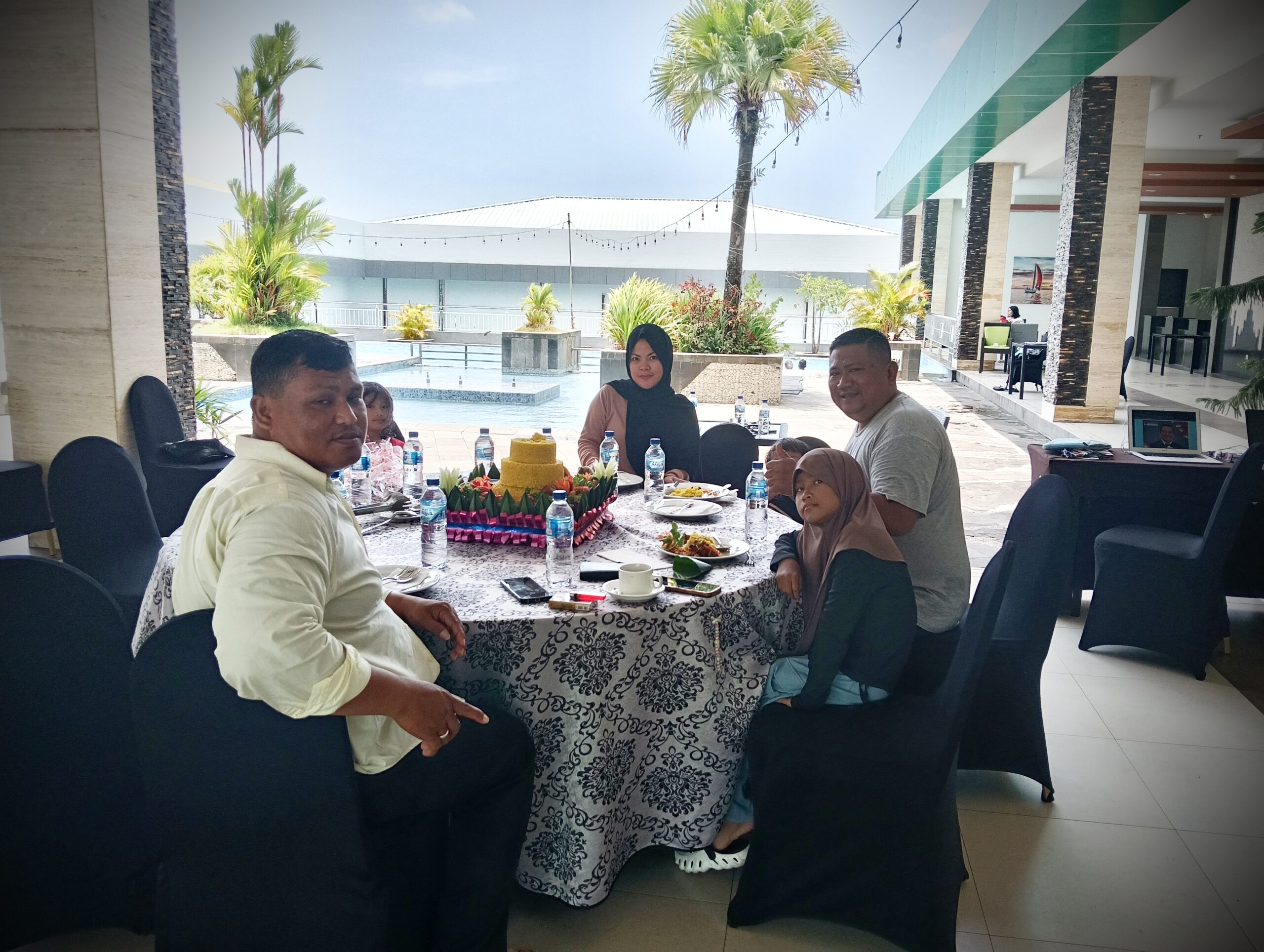 Acara sederhana namun penuh makna tersebut dihadiri oleh keluarga dan sahabat dekat. Dengan latar pemandangan kolam renang dan suasana santai di area terbuka hotel, momen bahagia itu berlangsung penuh kehangatan dan kebersamaan.