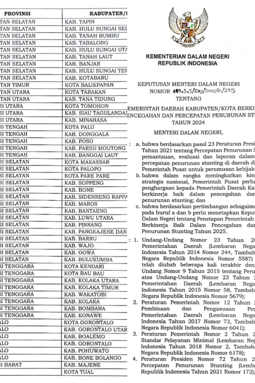 Hal ini tertuang dalam Keputusan Menteri Dalam Negeri Republik Indonesia Nomor 400.5.5/Kep/Bangda/2025 yang menetapkan Pinrang sebagai salah satu Kabupaten/Kota berkinerja terbaik dalam penanganan stunting tahun 2024.