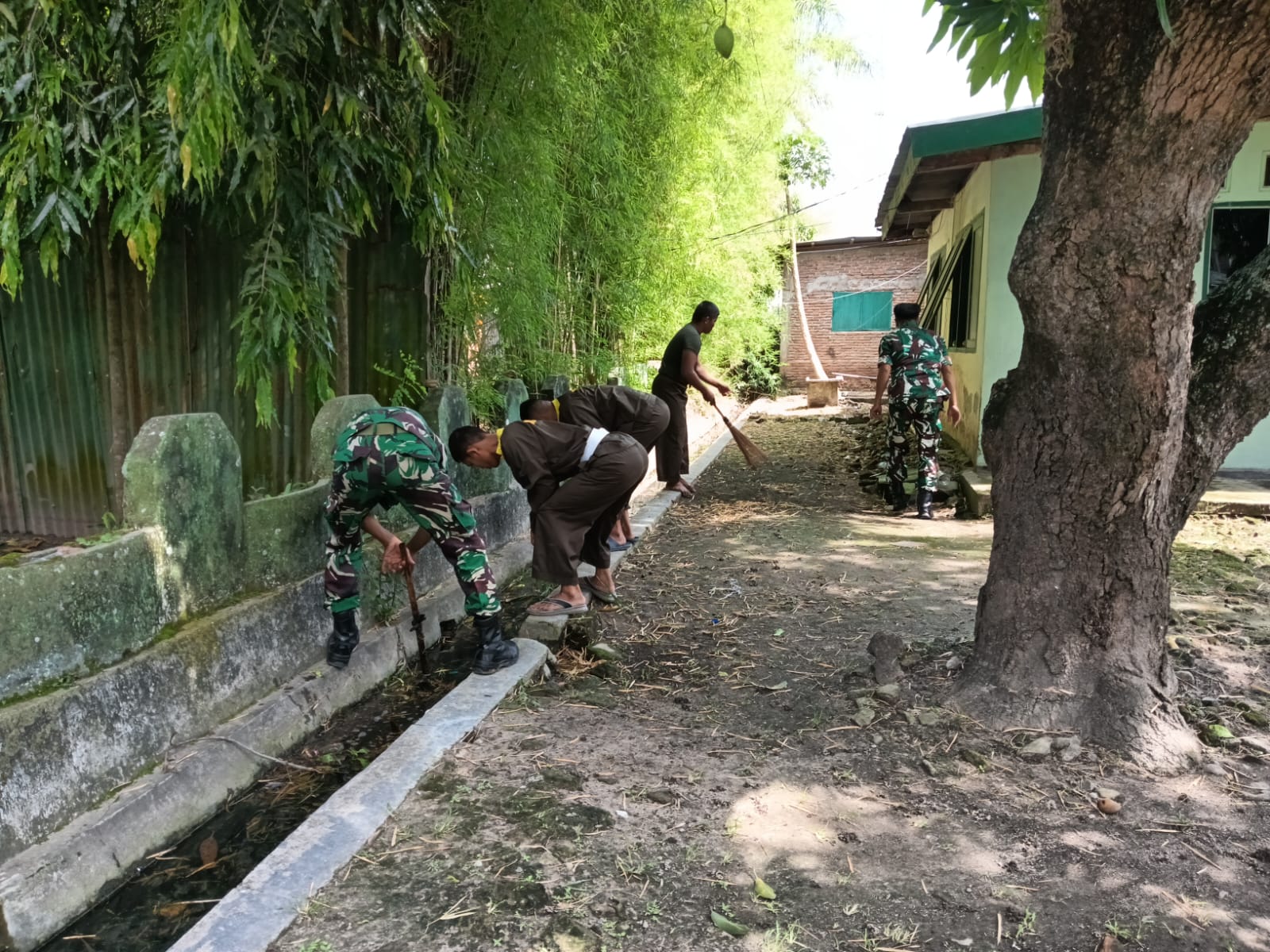 Seluruh personel bahu-membahu membersihkan sampah, lumpur, dan rumput liar yang menumpuk di saluran air. Dengan membersihkan got, diharapkan aliran air menjadi lancar, sehingga dapat meminimalisir risiko genangan air dan banjir di lingkungan asrama maupun permukiman warga sekitar.