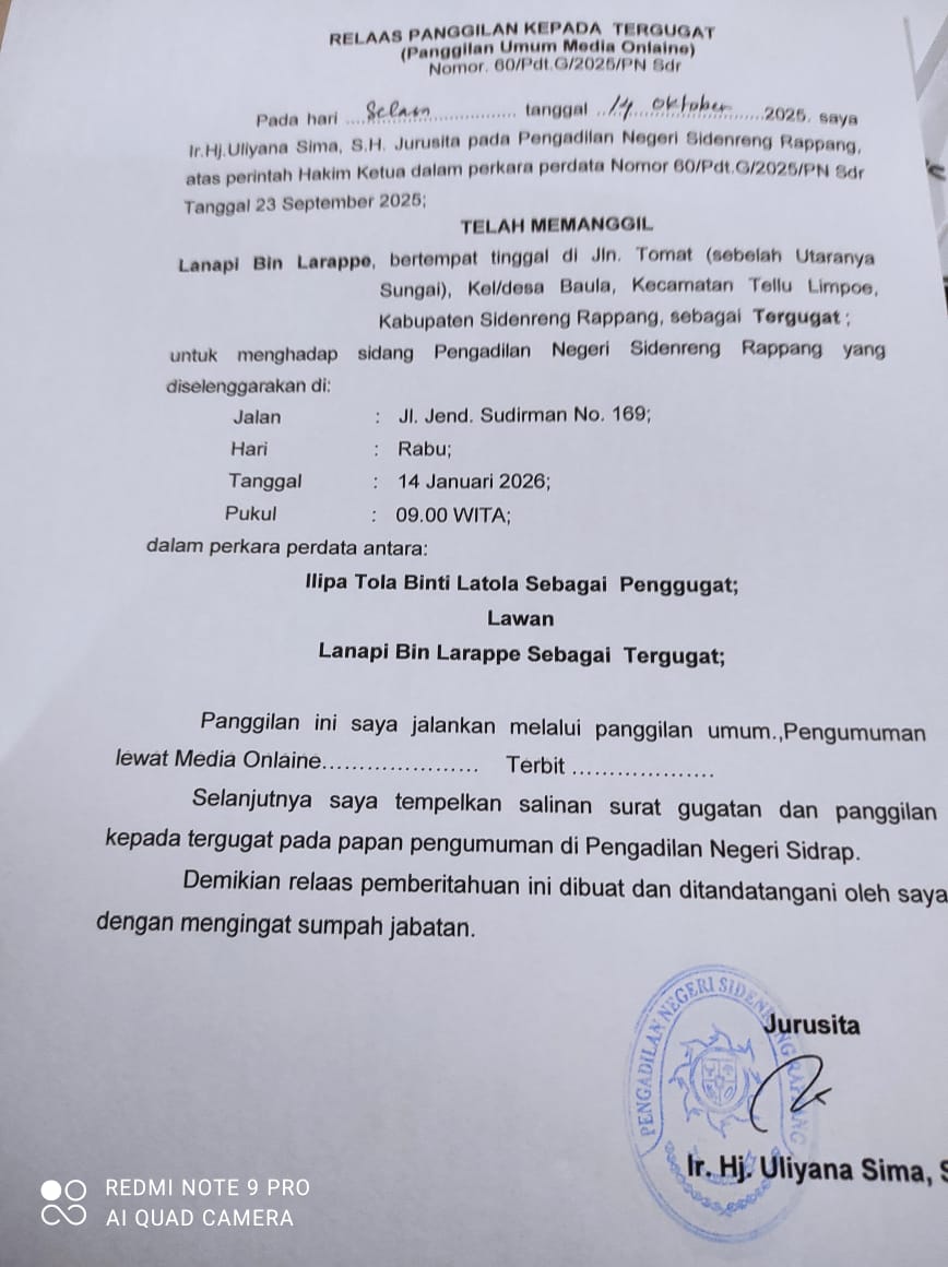 Sidenreng Rappang — Berdasarkan perintah Hakim Ketua Pengadilan Negeri Sidenreng Rappang dalam perkara Nomor 60/Pdt.G/2025/PN Sdr, pada hari Selasa tertanggal 14 Oktober 2025, Jurusita Pengadilan Negeri Sidrap Ir. Hj. Uliyana Sima, S.H. telah melaksanakan panggilan umum kepada Tergugat melalui media online dan papan pengumuman Pengadilan Negeri Sidrap.