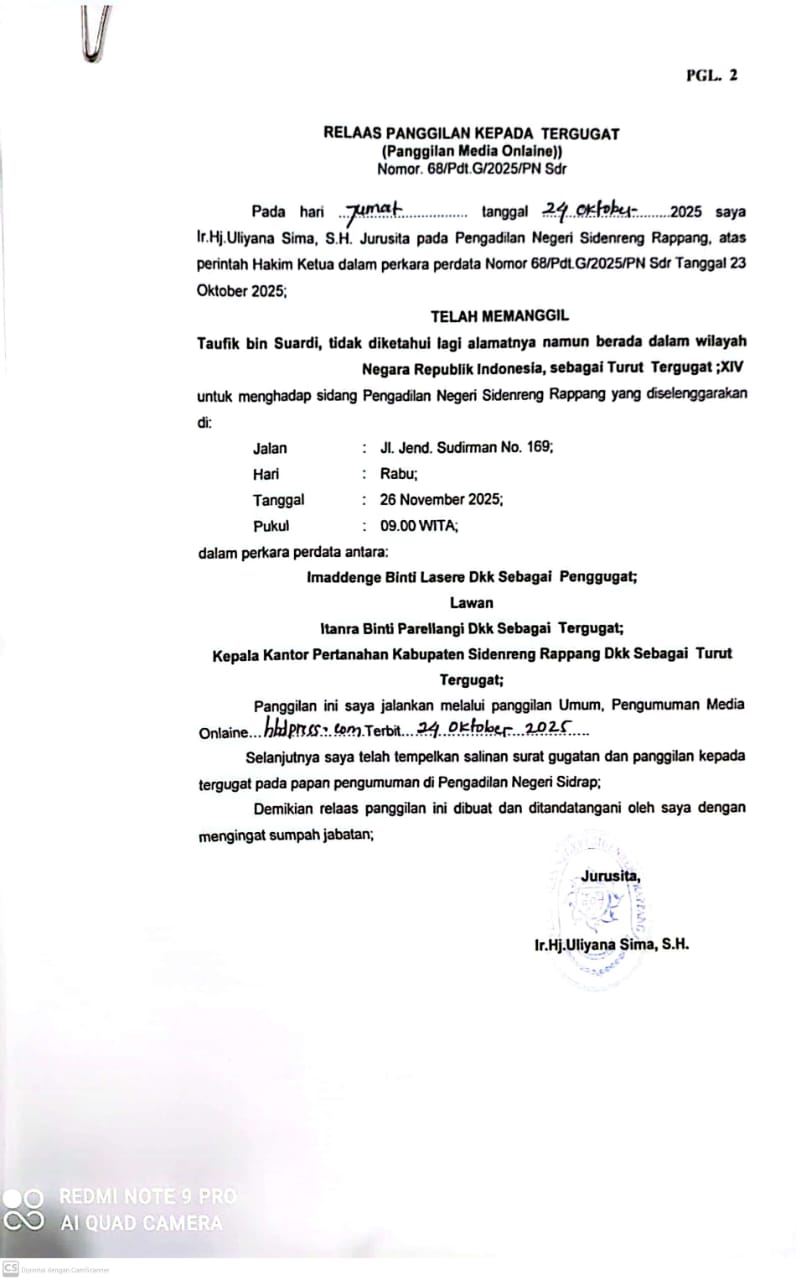 SIDRAP – Pengadilan Negeri Sidenreng Rappang memanggil pihak turut tergugat XII bernama Taufik bin Suardi, yang hingga saat ini alamatnya belum diketahui, untuk hadir dalam persidangan perkara perdata Nomor 68/Pdt.G/2025/PN Sdr.
