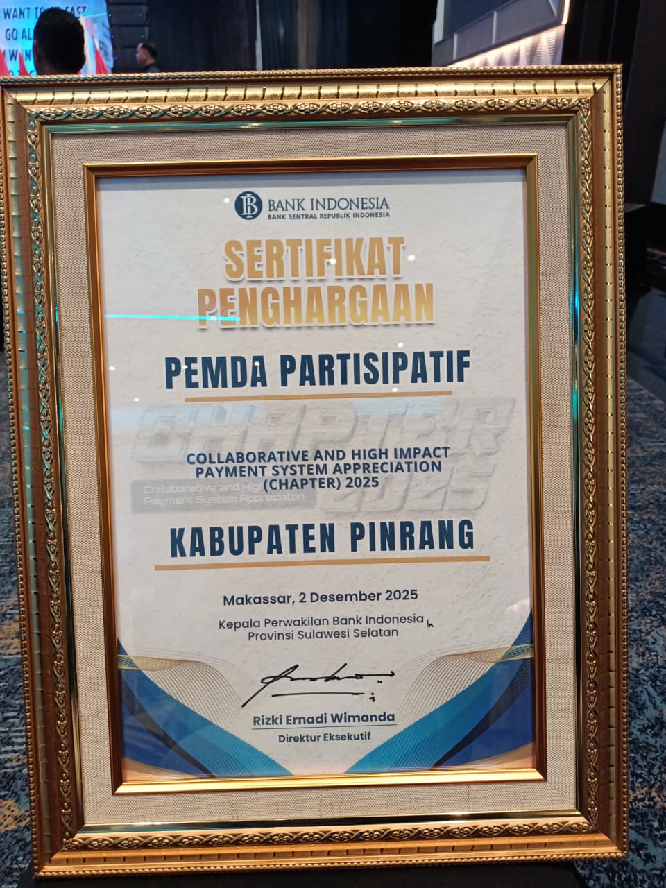 Pada kesempatan tersebut, Kepala Bidang Pendapatan Badan Pengelolaan Keuangan dan Pendapatan Daerah (BPKPD) Kabupaten Pinrang, Harumin, hadir mewakili Pemerintah Kabupaten Pinrang untuk menerima penghargaan. Adapun tiga penghargaan yang diraih yakni Juara 2 Implementasi Kartu Kredit Pemerintah Daerah (KKPD), Juara 2 Pemanfaatan E-Commerce dalam Belanja Daerah dan Penghargaan atas Partisipasi Aktif dalam Digitalisasi Pembayaran Daerah.