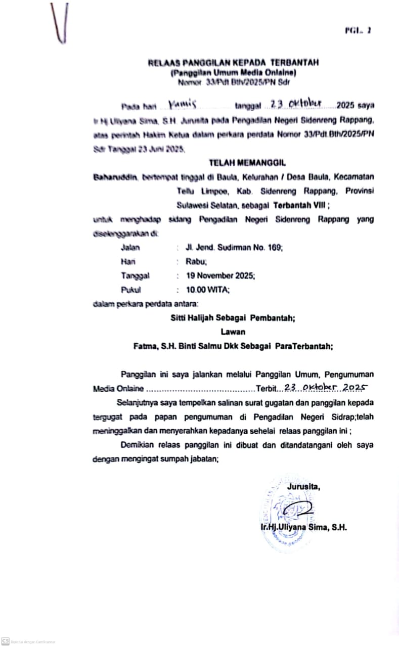 SIDRAP — Berdasarkan Penetapan Majelis Hakim Pengadilan Negeri Sidenreng Rappang dalam perkara perdata Nomor 33/Pdt.Bth/2025/PN Sdr, tanggal 23 Oktober 2025, Jurusita Pengadilan Negeri Sidenreng Rappang, Ir. Hj. Uliyana Sima, S.H., dengan ini memanggil secara resmi melalui panggilan umum (media online):
