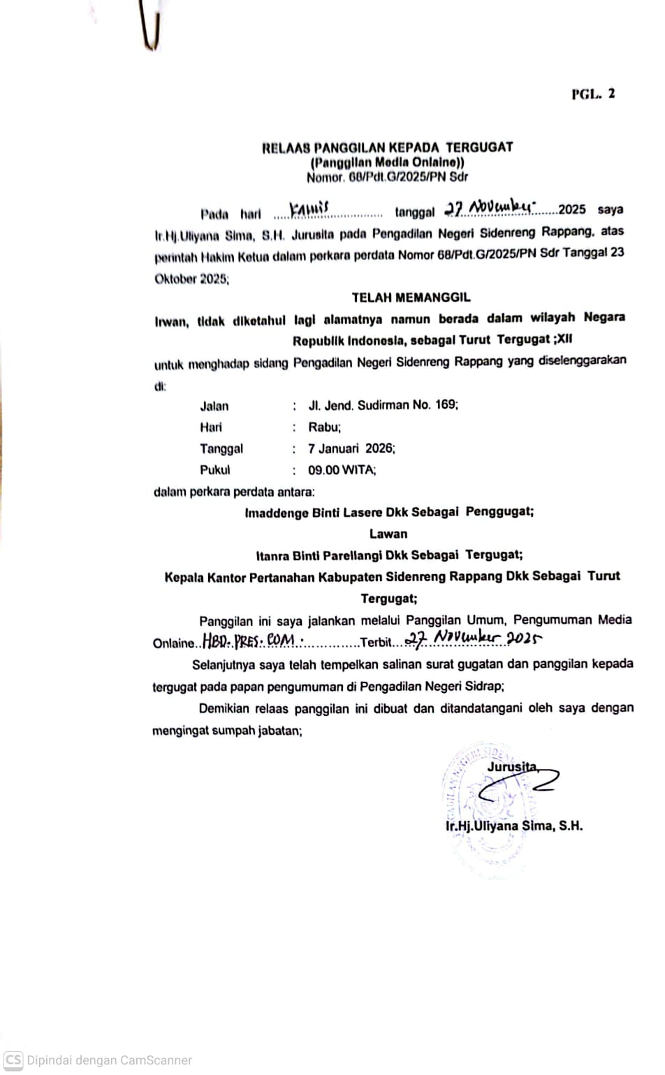 Sidrap — Pada hari KAMIS tanggal 27 November 2025 saya Ir. Hj. Ulyana Sima, S.H., Jurusita pada Pengadilan Negeri Sidenreng Rappang, atas perintah Hakim Ketua dalam perkara perdata Nomor 68/Pdt.G/2025/PN Sdr Tanggal 23 Oktober 2025;