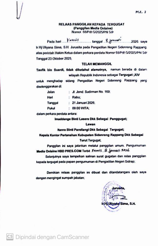 Selanjutnya saya tempelkan salinan surat gugatan dan relaas panggilan kepada tergugat pada papan pengumuman di Pengadilan Negeri Sidrap.