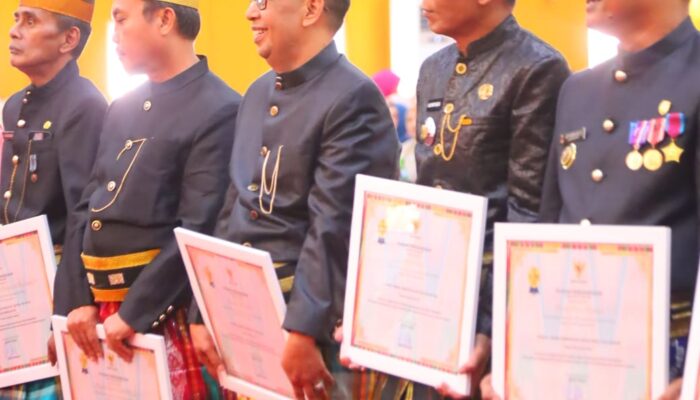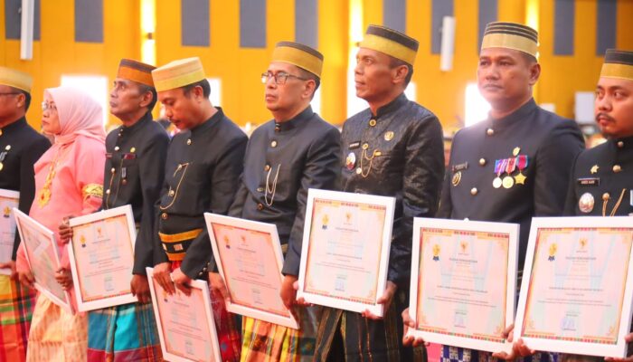 Mengenakan pakaian adat Bugis lengkap — jas tutup berwarna gelap, songkok Recca, dan lipa’ sabbe bermotif warna-warni — para pejabat tampil membanggakan saat menerima piagam penghargaan berbingkai putih di hadapan hadirin.