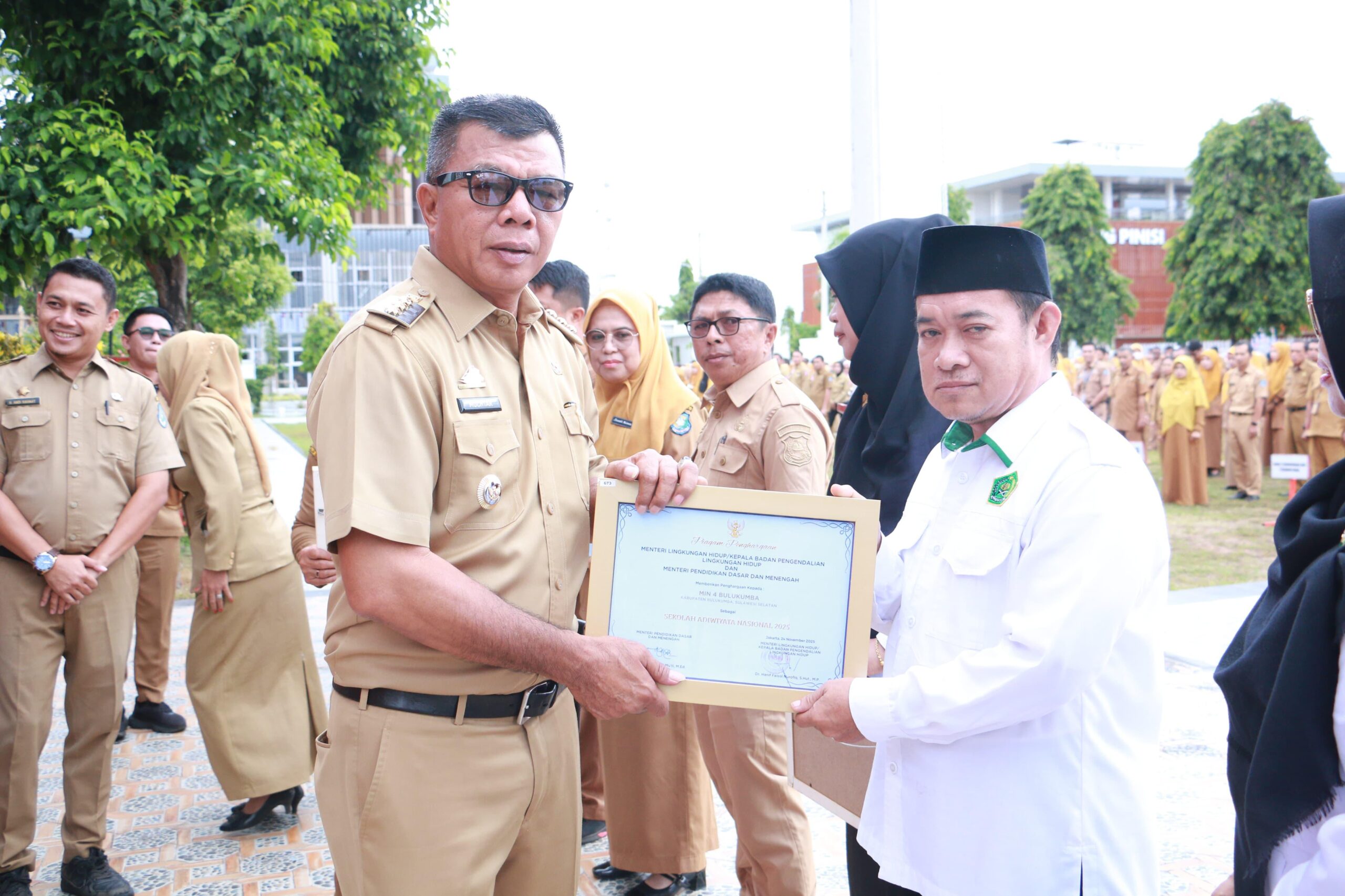 Bulukumba,- Bupati Bulukumba Andi Muchtar Ali Yusuf di sela Apel Gabungan OPD menyerahkan Piala dan Piagam kepada 12 kepala sekolah yang menerima penghargaan Adiwiyata Tahun 2025, di halaman Kantor Bupati Bulukumba, Senin 15 Desember 2025.