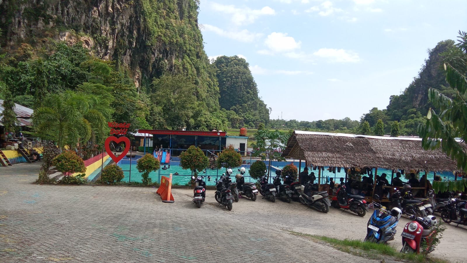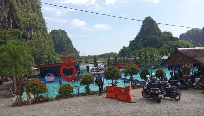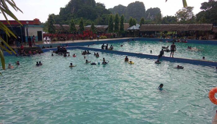Sejak pagi, kendaraan sudah mulai berdatangan dan memadati area parkir. Suara tawa anak-anak yang bermain di kolam renang bercampur dengan obrolan pengunjung yang bersantai di gazebo, menciptakan suasana yang hidup namun tetap tenang berkat latar belakang pemandangan tebing karst dan hamparan sawah yang hijau.