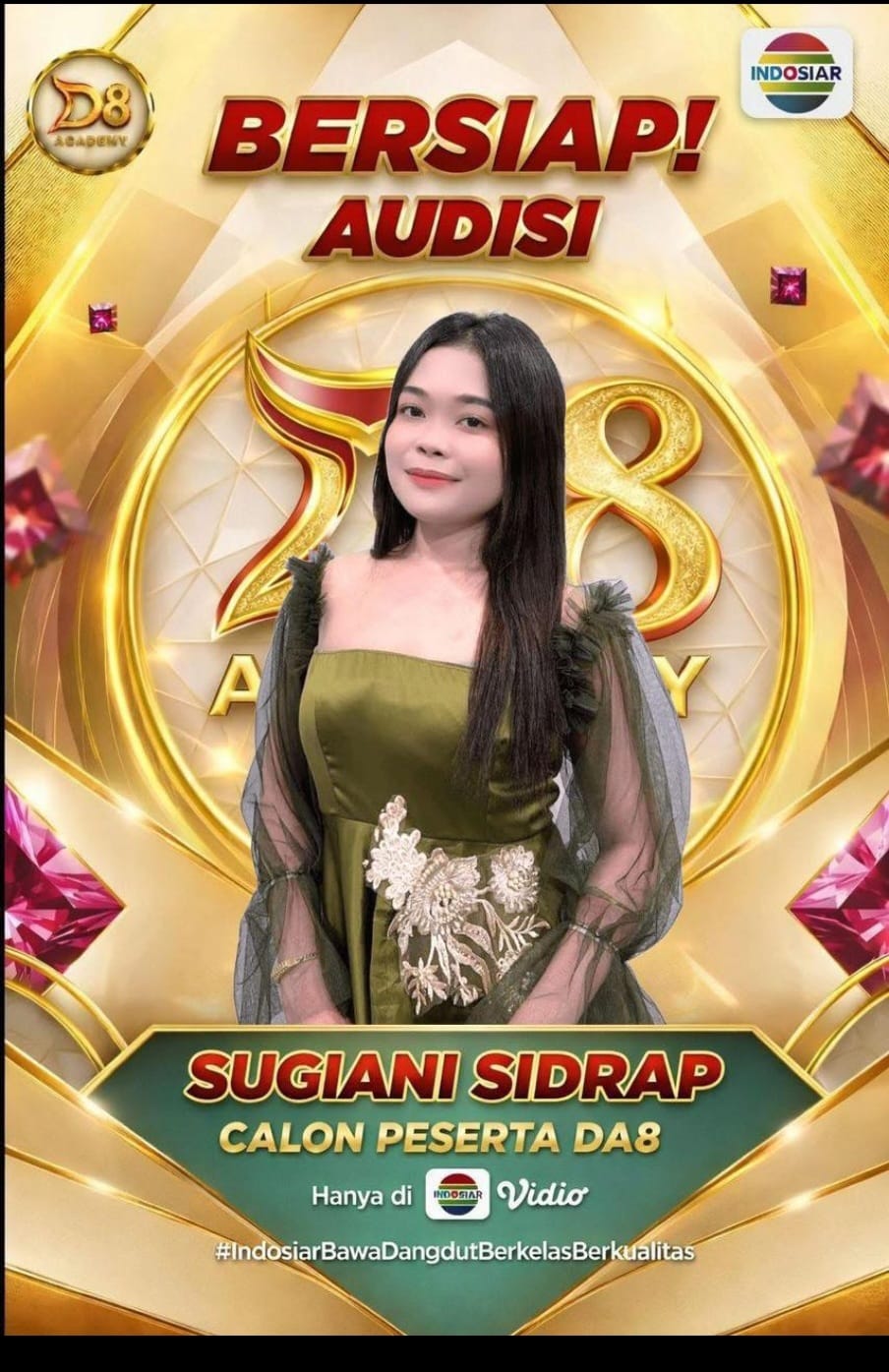 Dalam poster resmi yang beredar, Sugianti tampil anggun mengenakan gaun hijau elegan dengan latar logo D’Academy 8, disertai tulisan “Bersiap! Audisi”. Ia disebut sebagai calon peserta yang akan membawa nama Sidrap di panggung nasional.