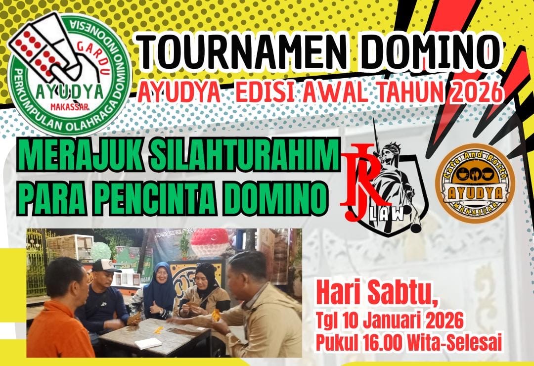 Makassar — Perkumpulan Olahraga Domino Indonesia (PORDI) Gardu Ayudya Makassar menggelar Turnamen Domino AYUDYA Edisi Awal Tahun 2026 sebagai ajang silaturahmi para pencinta domino di Kota Makassar dan sekitarnya. Kegiatan ini dilaksanakan di Gardu Ayudya PORDI Makassar tepatnya BTN. Hamzy Blok-S RT/RW 05/02 Kel.Tamalanrea Indah Kecamatan Tamalanrea Kota Makassar