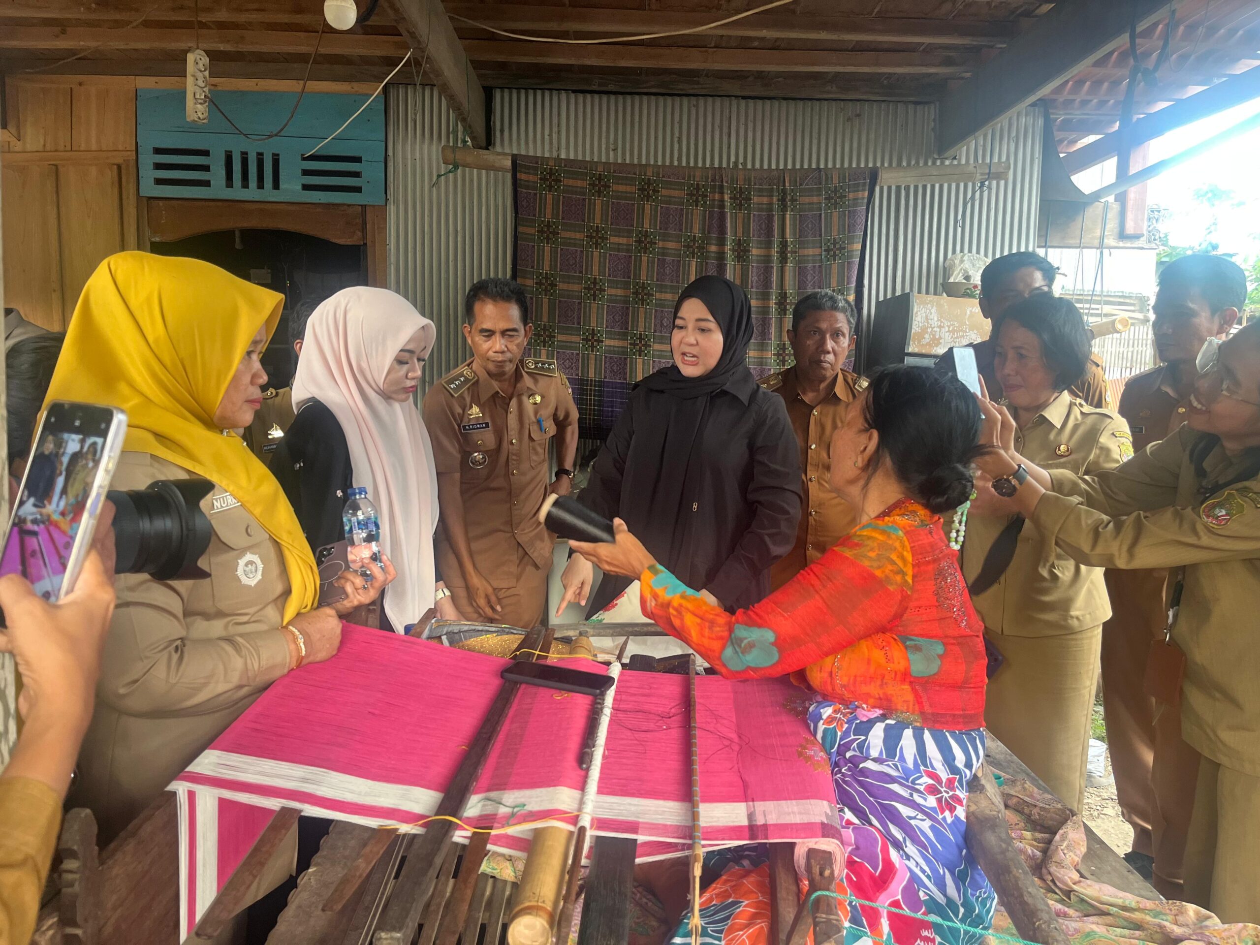 Di sela peninjauan, Fatmawati Rusdi berdialog dengan para perajin mengenai tantangan yang dihadapi, termasuk pemasaran produk, ketersediaan bahan baku, hingga upaya meningkatkan kualitas dan daya saing tenun lipa sabbe di pasar yang lebih luas.